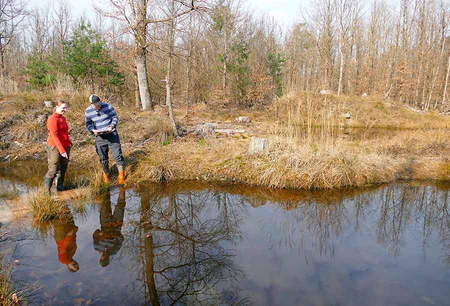 Doch es gibt auch eine gute Nachricht: Mit vergleichsweise geringem Aufwand lässt sich Frosch & Co. wirksam helfen. Wie das im Wald gelingen kann, zeigt Revierleiter Gregor Wobschall. In den vergangenen neun Jahren hat er in Abstimmung mit der Gemeinde im Kommunalwald Kreuzwertheim rund 150 Tümpel angelegt. Vorrangig nutzte er dafür Schadflächen, auf denen eine Aufforstung aufgrund staunasser Böden nur eingeschränkt möglich ist. Bäume können dort keine tiefen Wurzeln ausbilden und sind daher gegenüber den zunehmenden Trockenperioden besonders anfällig. Für die Anlage von Tümpeln sind solche Standorte hingegen ideal. In Kombination mit reichlich liegendem Totholz und dichter Bodenvegetation im Umfeld entstanden auch hervorragende Lebensbedingungen für die erwachsenen Tiere. Denn Wasser allein hilft den Amphibien nicht. Die meisten einheimischen Arten verbringen den Großteil ihres Lebens an Land. Hier sind sie auf geeignete Rückzugsorte angewiesen, die sie vor großer Sonneneinstrahlung und vor Fressfeinden schützen.