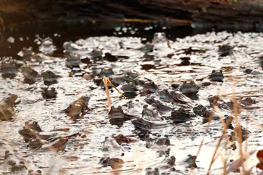 Ein 2023 von einer Forstanwärterin entwickeltes Vernetzungskonzept bildet inzwischen die Grundlage für die Anlage weiterer Tümpel. So können gezielt Lücken geschlossen werden, die bislang die Wanderungen der Amphibien erschwert haben. Dass sich dieses Engagement auszahlt, zeigen aktuelle Bestandsaufnahmen der Biologin Kim Fasse. Sie nutzte die derzeit gut sichtbaren Laichballen von Fröschen und Kröten, um Rückschlüsse auf die Anzahl der erwachsenen Tiere zu ziehen. So steht ein Laichballen des Springfroschs für zwei adulte Tiere – ein Männchen und ein Weibchen. Bei der Erdkröte kann sogar auf bis zu sechs erwachsene Tiere geschlossen werden, da sich häufig mehrere Männchen um ein Weibchen scharen. Auf Grundlage dieser Erhebungen leben im Untersuchungsgebiet derzeit schätzungsweise 1600 Springfrösche, 2700 Grasfrösche und 600 Erdkröten. Damit haben sich die Bestände seit der ersten Kartierung im Jahr 2023 deutlich erhöht – beim Grasfrosch sogar mehr als verdreifacht.